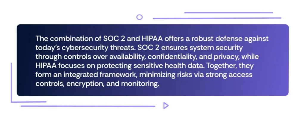 SOC 2’s focus on security, availability, and confidentiality complements and fortifies HIPAA’s strict mandates for PHI. Implementing both frameworks ensures a robust, layered defense, reducing the likelihood of breaches while bolstering overall data privacy and cybersecurity.