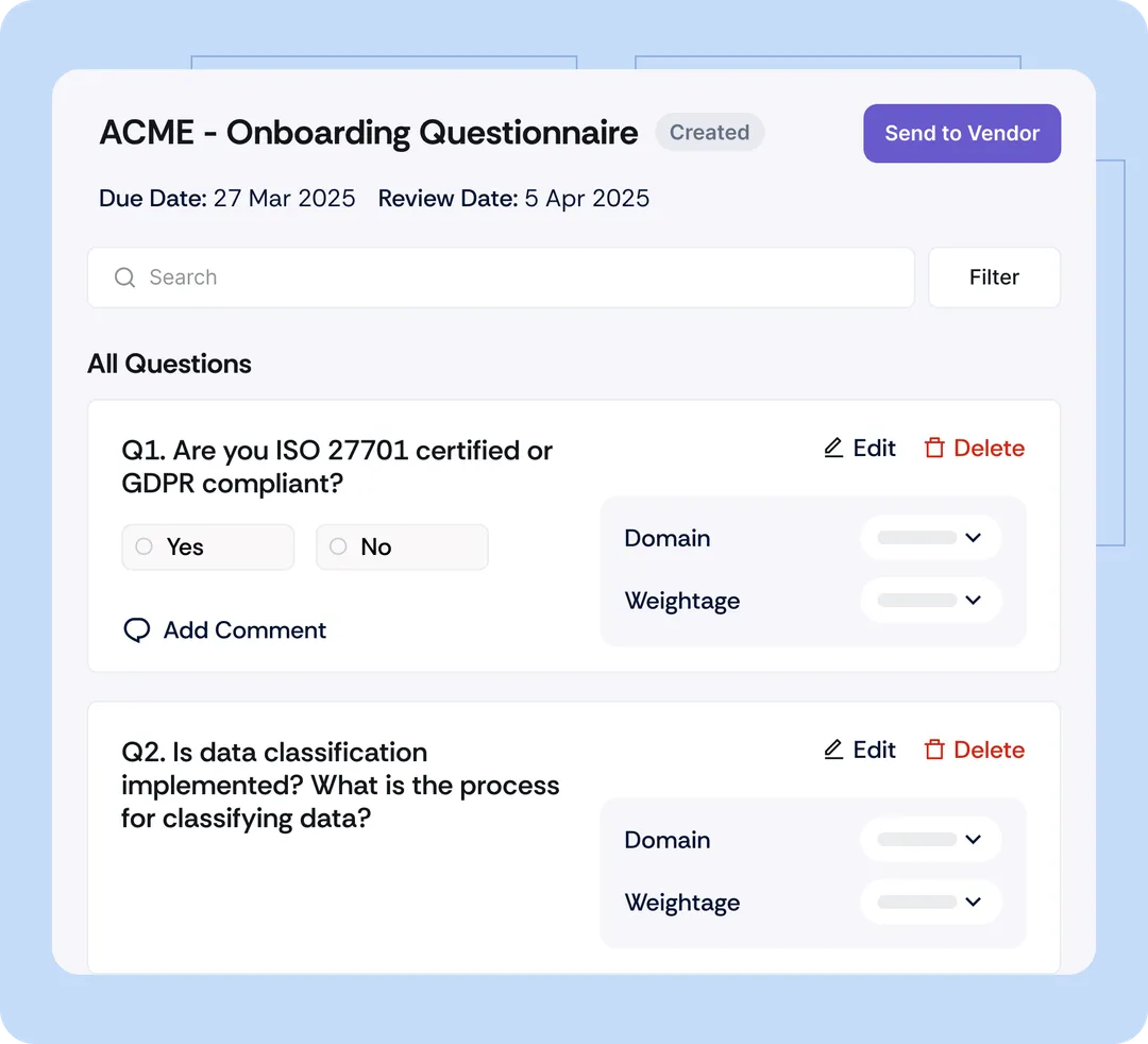Allow vendors to manage assessments and submit responses through a single login. Collaborate easily and get responses on time.