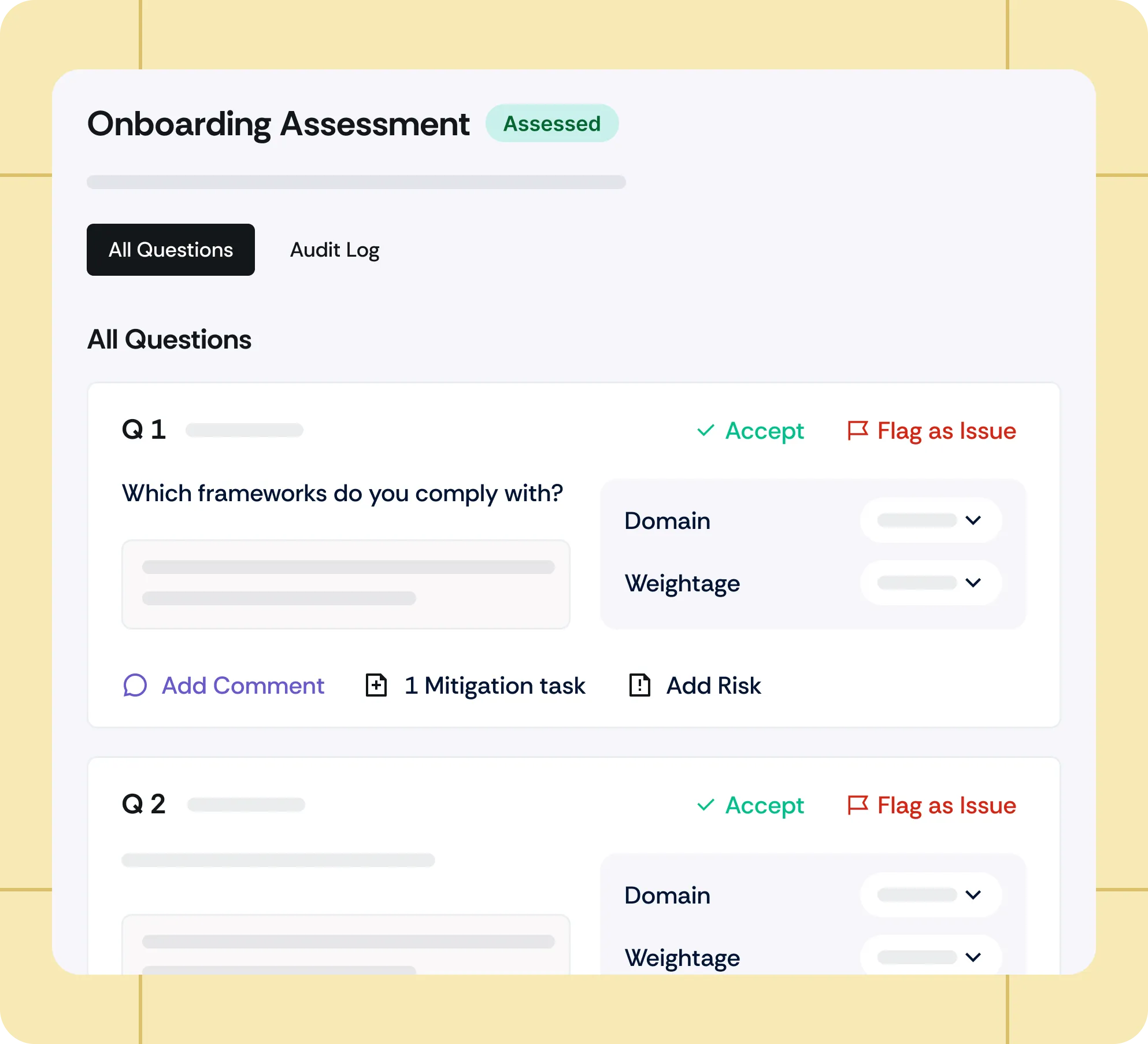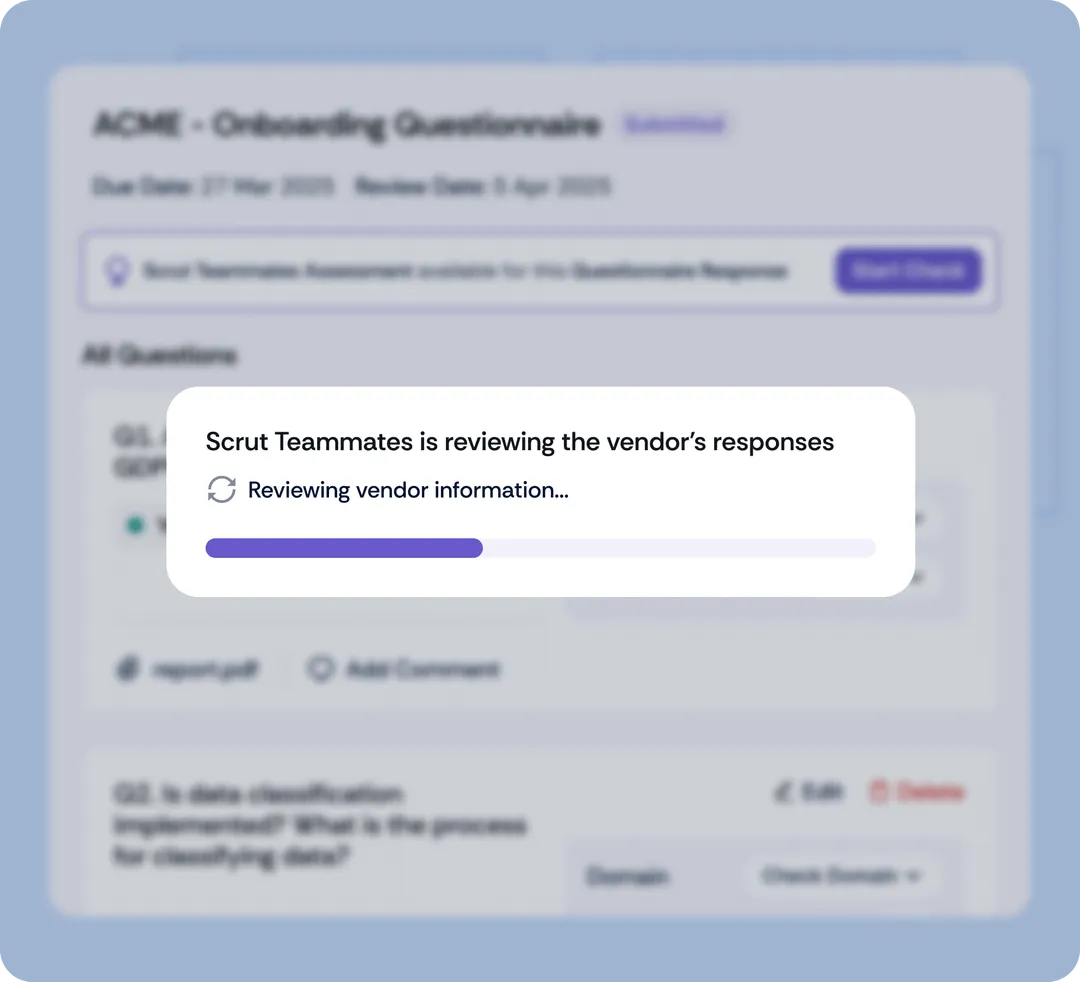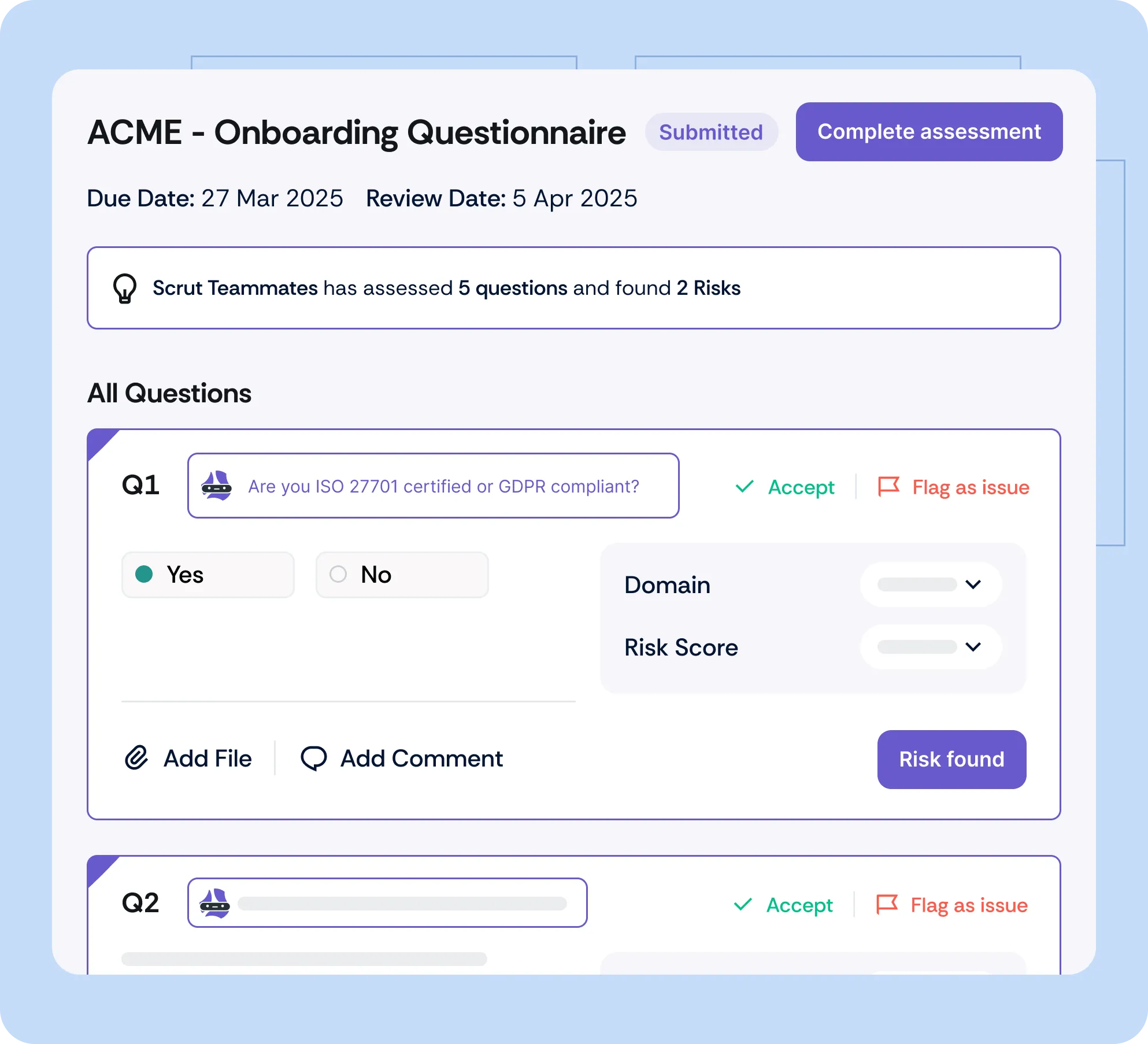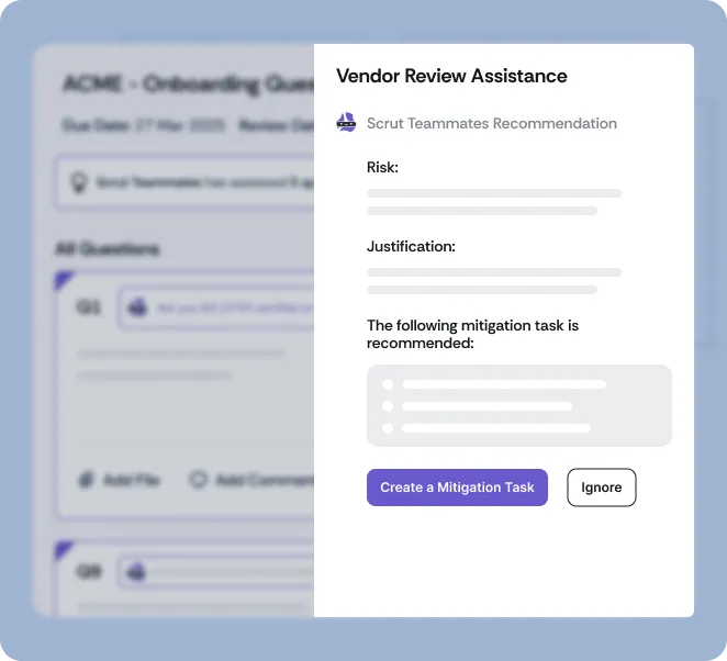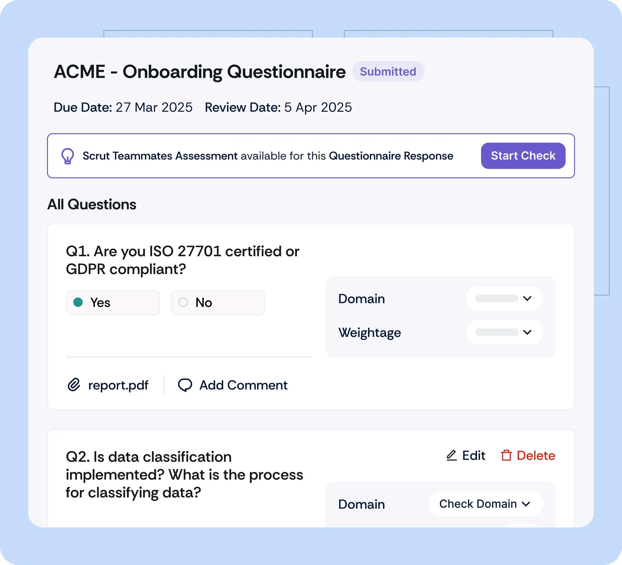 Automatically generate risk assessment questionnaires tailored to each vendor’s inherent risk level using Scrut Teammates.