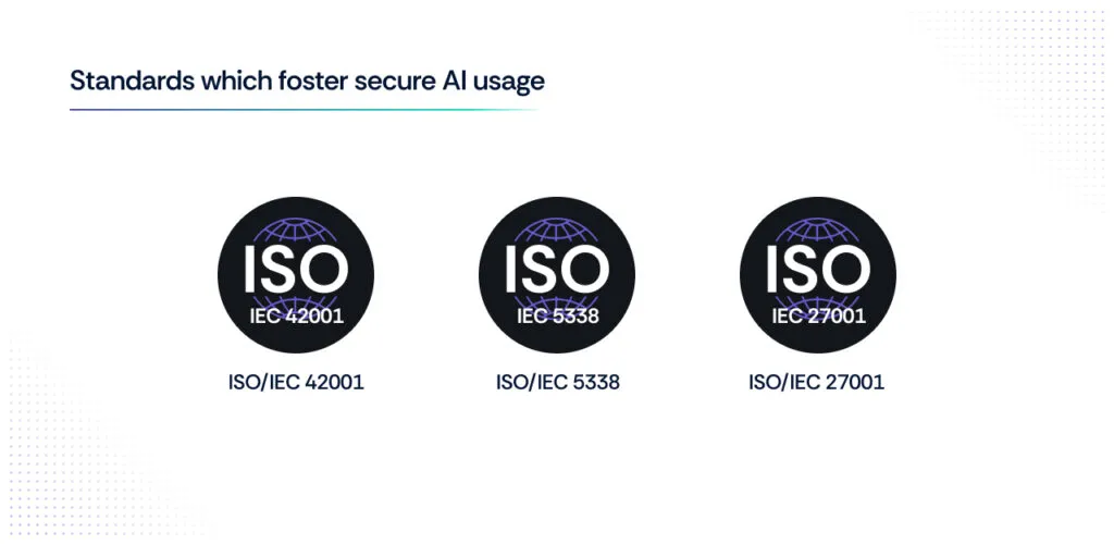 - ISO/IEC 27001: Updated in 2022, the global standard for information security will be highly applicable to those using AI. Companies pursuing or maintaining this standard will need to consider carefully the implications of such systems on: