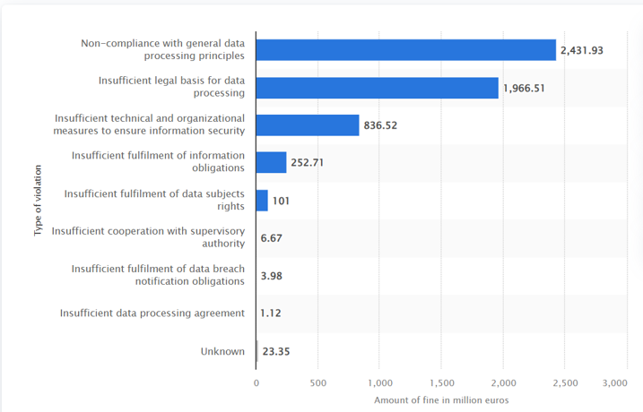For example, since GDPR came into effect in 2018, the most significant share of penalties have been due to violations of general data processing principles—amounting to over €2.4 billion in fines.