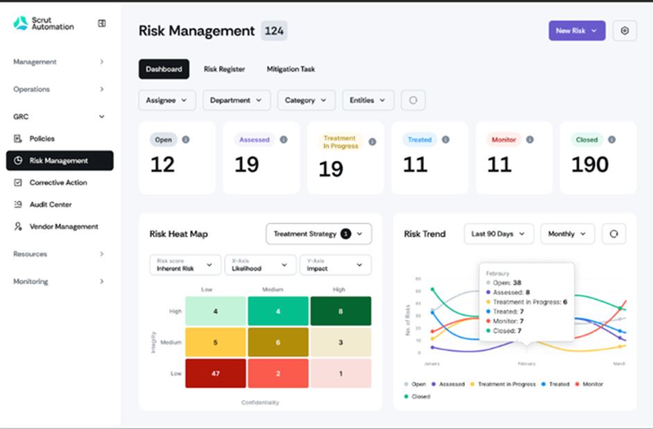 Scrut Risk Management offers automated workflows to streamline risk assessments and execute treatment plans for remediation, acceptance, transference, or avoidance. Its dashboard visualizes risk assessment findings through heatmaps, trend analysis, and graphs. This improves visibility into your organization’s risk posture by dynamically updating risk scores as related risks or mitigation efforts change.Â
