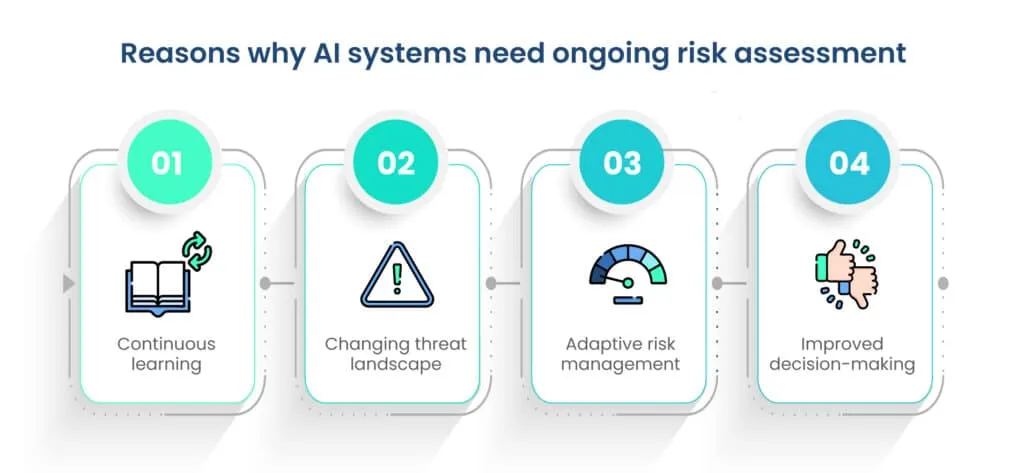 The dynamic nature of AI, characterized by the components given below, makes ongoing risk assessment a critical component of AI applications. It ensures that AI systems remain effective, secure, and aligned with organizational objectives in a constantly evolving environment.