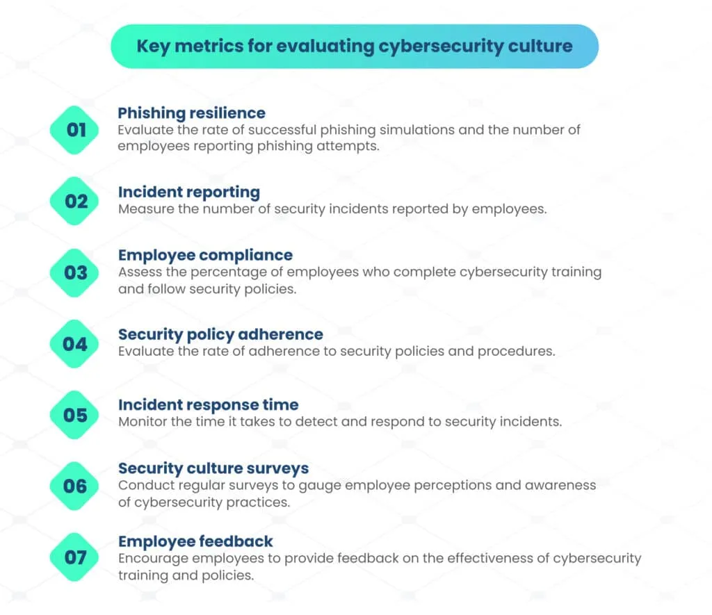 Measuring the success of your organization’s cybersecurity culture is essential to ensuring its effectiveness. Key metrics help assess the impact of your cybersecurity initiatives and employee engagement. These metrics may include: