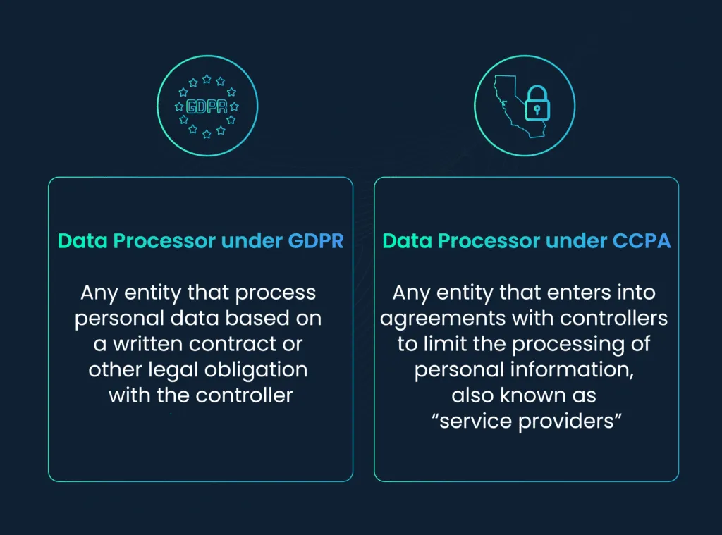 The CCPA does not explicitly recognize sub-processors and treats them as another service provider. While liability may be transferred contractually to these organizations, they don’t necessarily have the full brunt of legal responsibility carried by the business.
