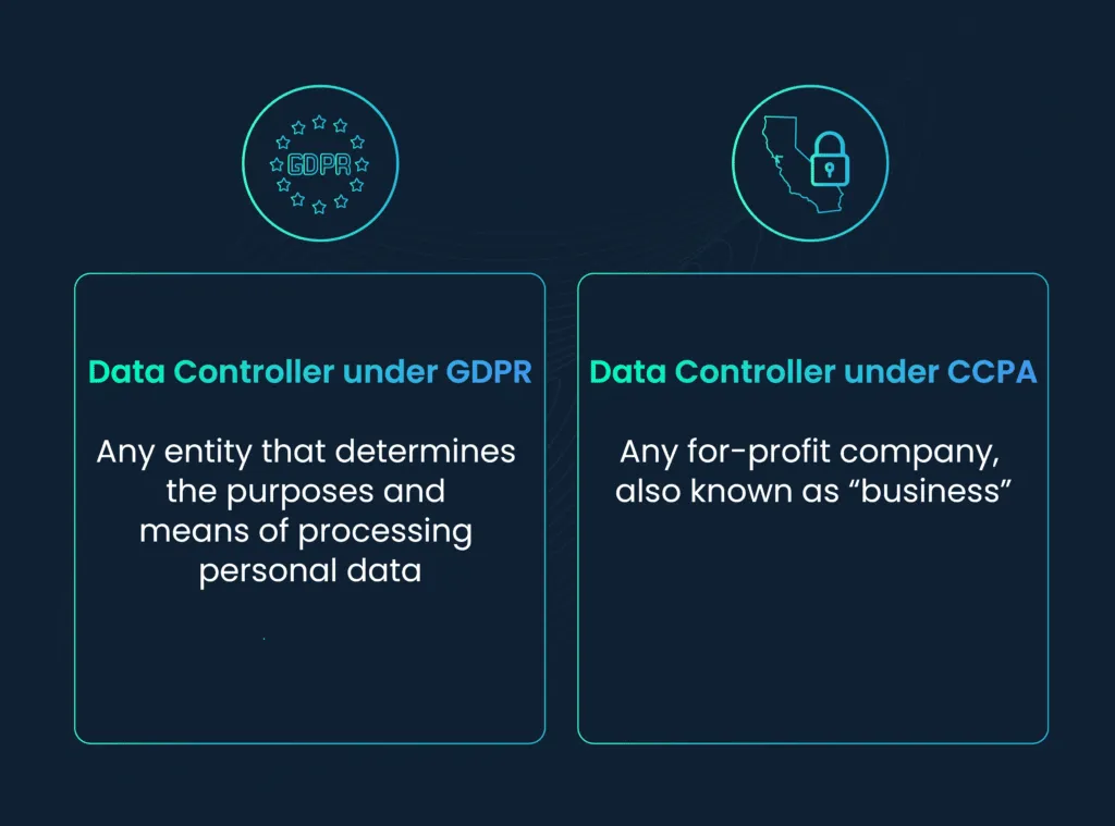 According to the GDPR, this is the entity that determines the purposes and means of processing personal data. It holds primary responsibility for data protection and can be a person, government agency, or corporation. An equivalent term used by the CCPA is “business,” but the law makes clear that it only applies to for-profit companies (with some narrow exceptions). This is a substantially narrower definition than that of the GDPR. Brazil’s LGPD has a very similar definition.