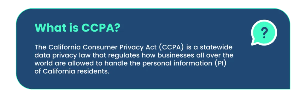 The CCPA is a state-wide data privacy law that regulates how businesses worldwide are allowed to handle the personal information (PI) of California residents. The CCPA gives consumers more control over the data that companies collect.