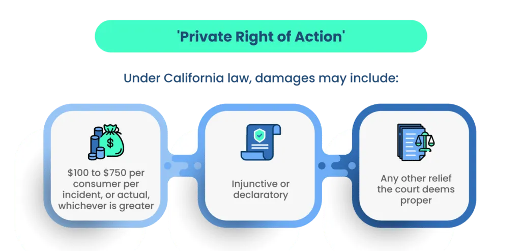 In cases of CCPA violations, consumers retain the right to file complaints and seek reparations for the harm caused. The compensation mandated ranges from $100 to $750 for each consumer incident, or the actual amount of damages suffered—whichever is of greater value.
