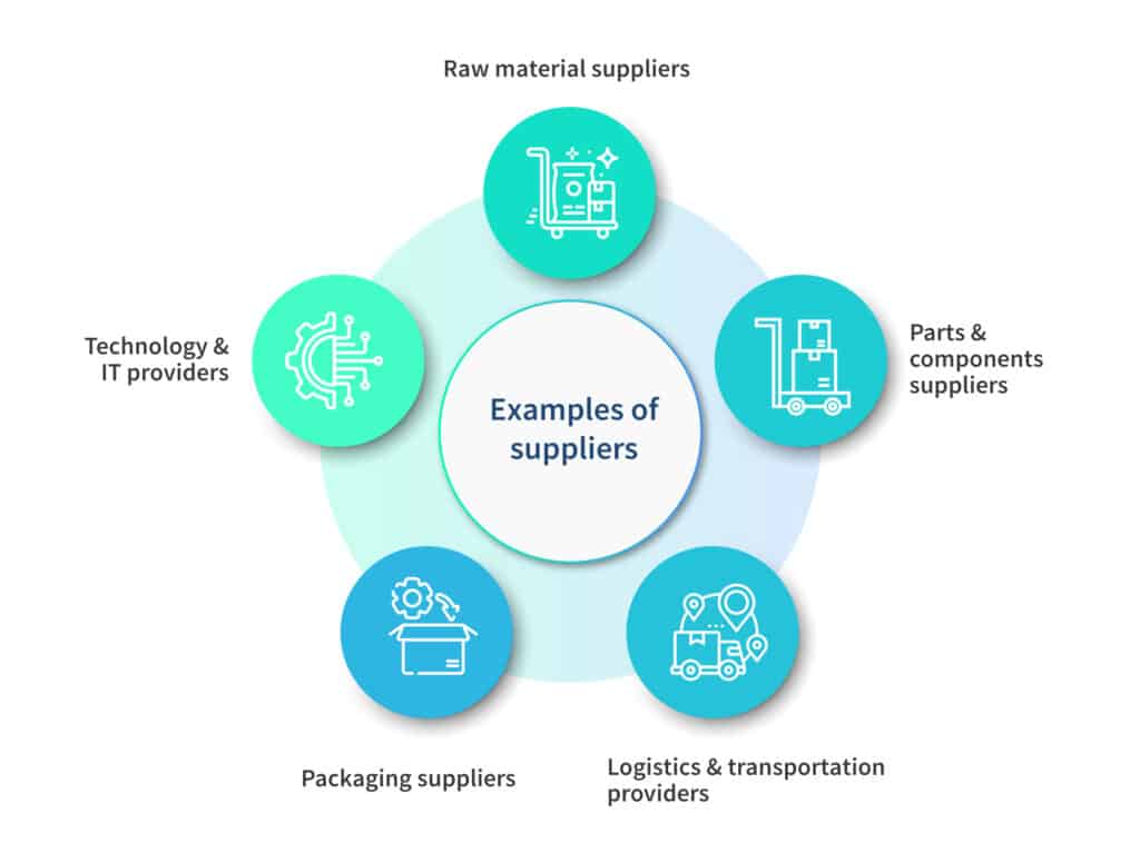 There are numerous suppliers and vendors that contribute to an organization’s supply chain. The specific suppliers and vendors can vary depending on the industry and the organization’s needs.