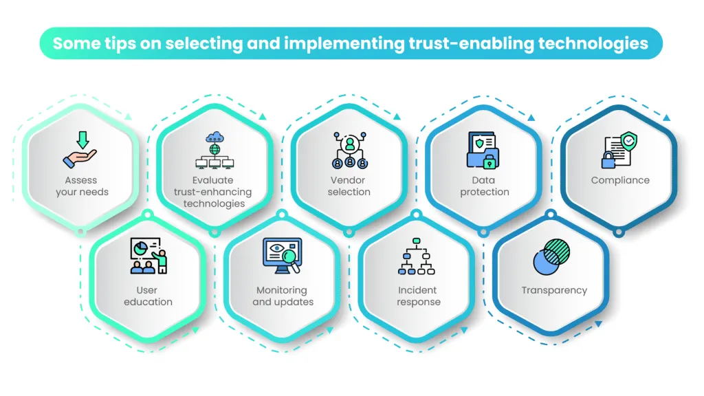 Selecting and implementing trust-enabling technologies involves a strategic approach that considers specific needs, evaluates technology options, and ensures compliance with security and privacy standards. Here are some key tips for success: