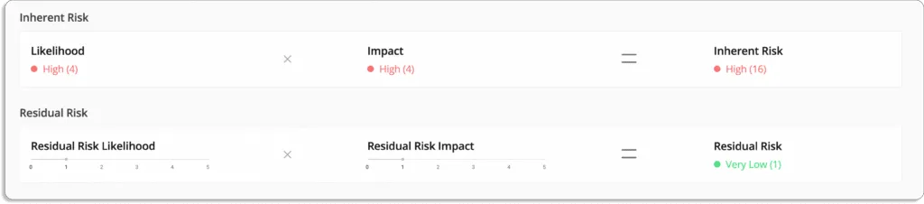 In the example below, the inherent risk score of 20 was reduced to a residual risk score of 4, indicating that this risk has become less impactful.