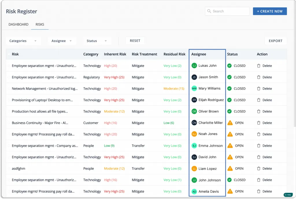 The platform eliminates the need to manage and constantly update a risk register on multiple spreadsheets. It collects all risks, their inherent and residual risk scores, mapped controls, and mitigating tasks in one place, which can then be easily shared with auditors for faster compliance audits.