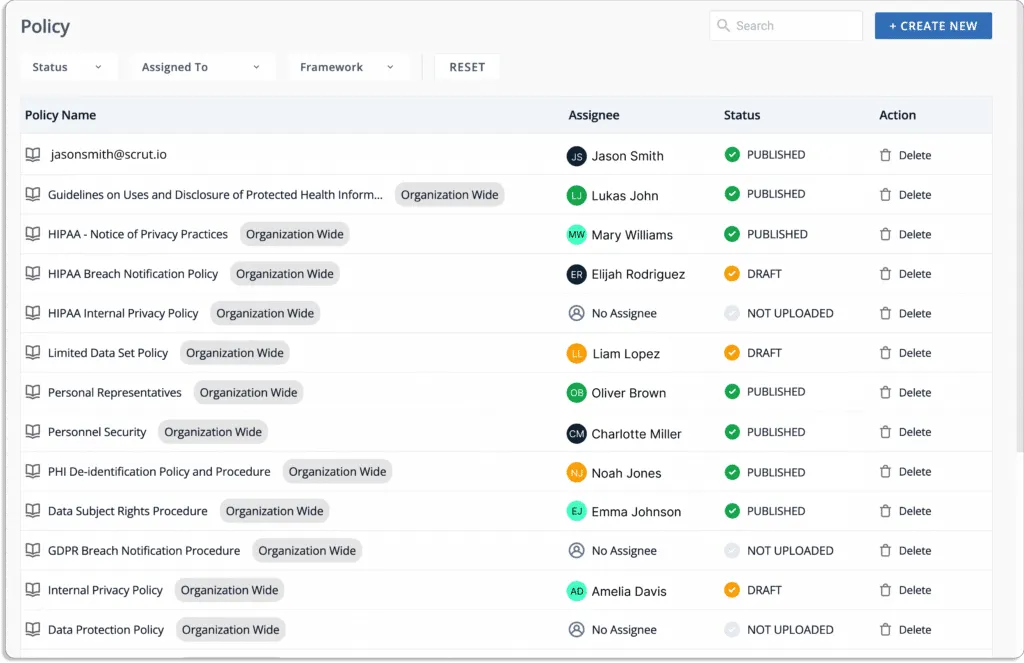 You can assign owners to policies for creating or making any changes to them. This ensures that policies are managed properly, and the policy owner is accountable for all tasks related to the policy. Further, the platform sends reminders to the policy owners (Slack, email) for any pending policy-related tasks.