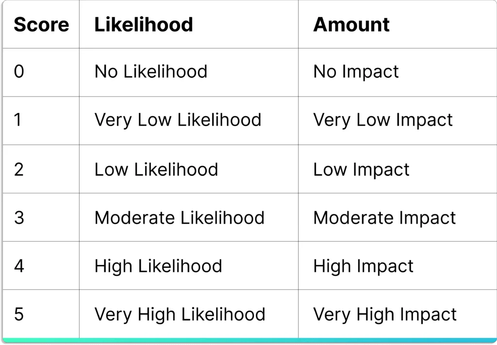 Risk scoring of events based on likelihood and impact.
