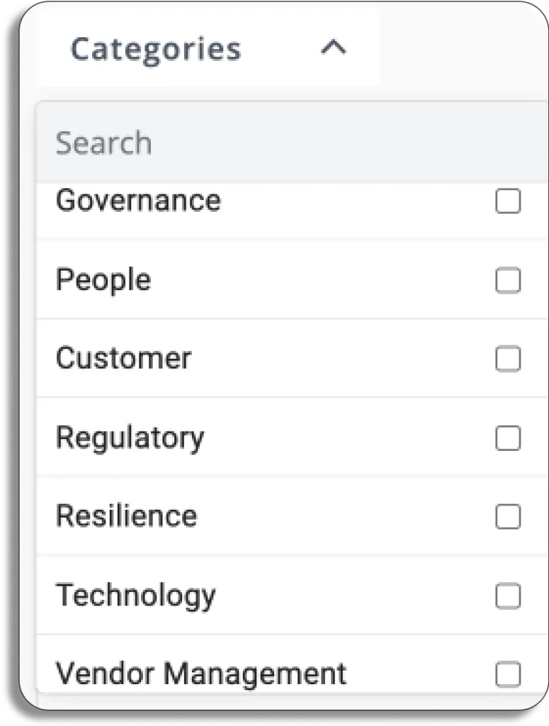 The Scrut’s risk categories are Governance, People, Customer, Regulatory, Resilience, Technology, and Vendor Management.