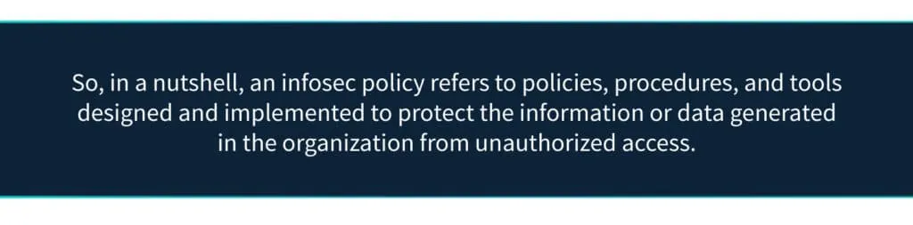 However, let us first clarify the difference between infosec policy and infosec procedure. Infosec policy is the policy designed to protect the organization’s data assets, while procedures are the actions recommended to follow the policy. On the other hand, infosec tools are the software, hardware, and applications used to protect information.