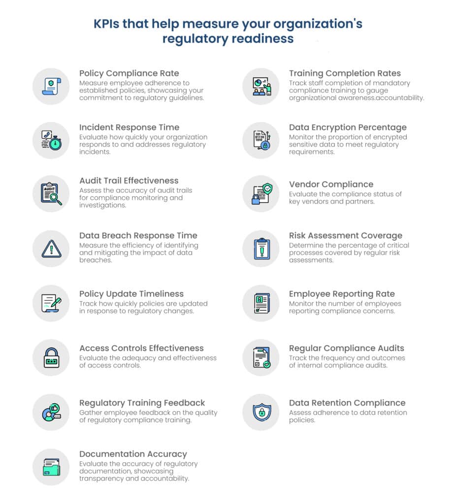 - Establish KPIs that align with your organization’s goals and regulatory requirements. Some critical KPIs include the timeliness of incident reporting and resolution, the percentage of employees completing mandatory training, and the accuracy of compliance documentation.
