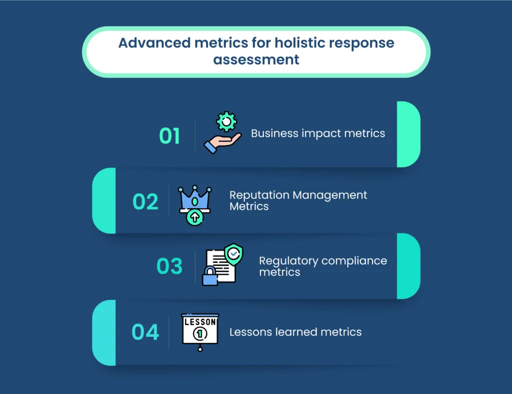 Advanced metrics such as business impact, reputation management, regulatory compliance, and lessons learned contribute to a more holistic evaluation. These metrics provide insights into financial repercussions, customer trust, legal adherence, and the organization’s capacity to learn and adapt.
