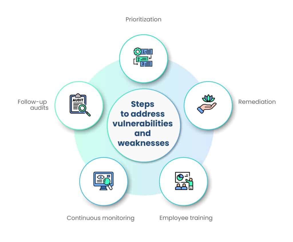 Once vulnerabilities and weaknesses are identified through the assessment, it’s essential to take prompt action to address them: