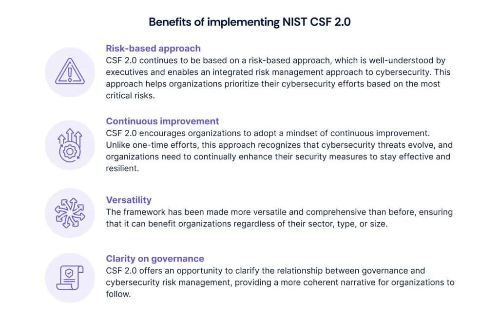 3. What are the benefits of implementing NIST CSF 2.0 for organizations? Implementing NIST CSF 2.0 enables organizations to adopt a risk-based approach to cybersecurity, prioritize continuous improvement, ensure versatility across sectors and sizes, and gain clarity on governance structures, ultimately enhancing their cybersecurity resilience.