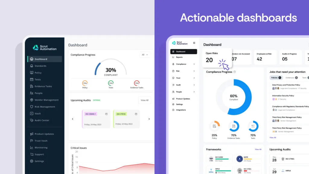 Reduce time hunting and gain more productive hours with Scrut’s new dashboard. The new look serves as a compass, guiding your next steps and driving desired outcomes effortlessly. Intuitive card placements and guided navigation mean less effort in managing tasks and quicker completions.