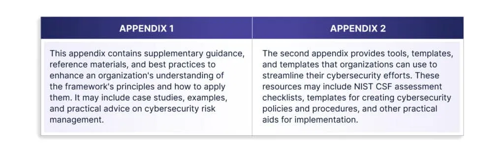The NIST Cybersecurity Framework 2.0 introduces two new appendices, which are intended to offer additional resources and information to assist organizations in effectively implementing the framework: