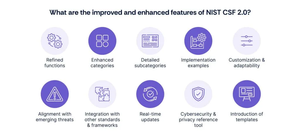 The NIST CSF 2.0 is anticipated to introduce several improved and enhanced features to offer better support to organizations in their cybersecurity efforts. These enhancements aim to provide organizations with more comprehensive and adaptable tools for managing cybersecurity risks effectively: