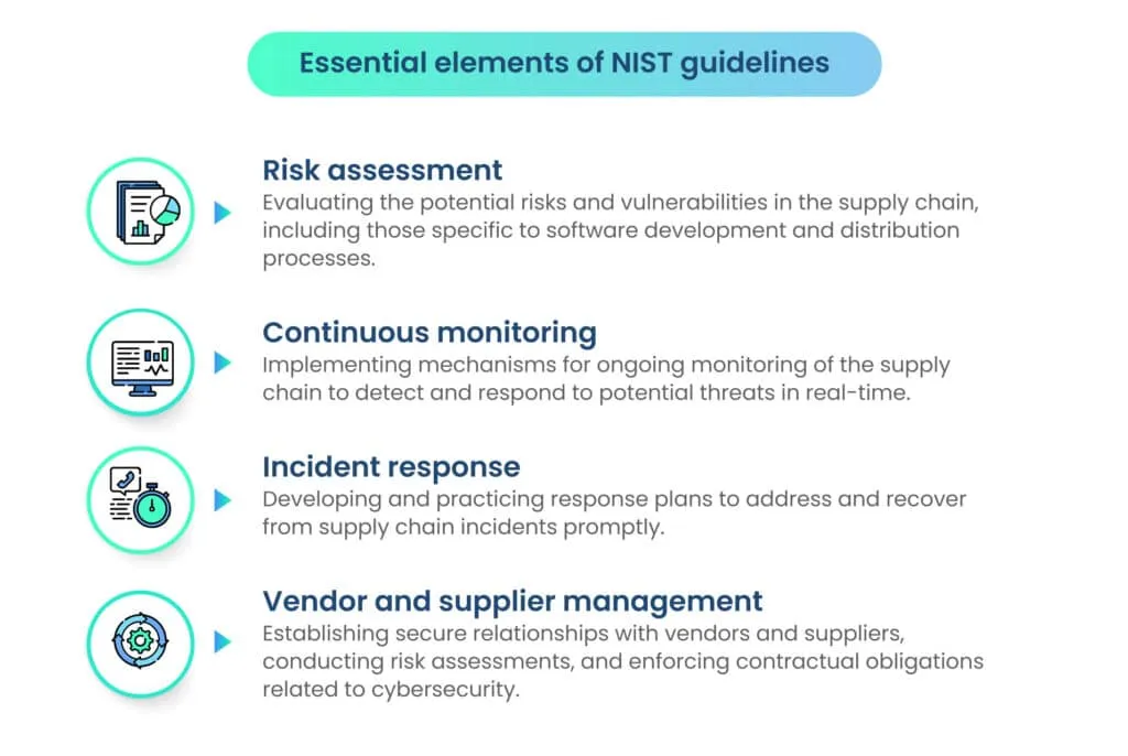 - Establish a cross-functional team: Form a dedicated team comprising cybersecurity experts, developers, and supply chain professionals to collaborate on implementing NIST guidelines.