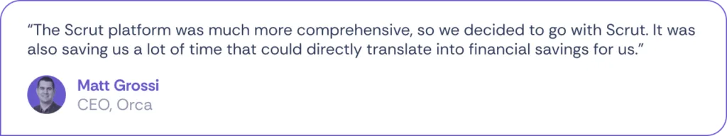 For example, Orca is a prominent provider of freight audits and analytics in Canada. As a SaaS platform dedicated to boosting their customers’ visibility and margins, Orca also expected a GRC solution that would offer similar benefits—efficiency and intuitiveness. They needed to ensure robust security measures and achieve multiple compliance certifications. After careful consideration, Orca chose the Scrut smartGRC™ platform.
