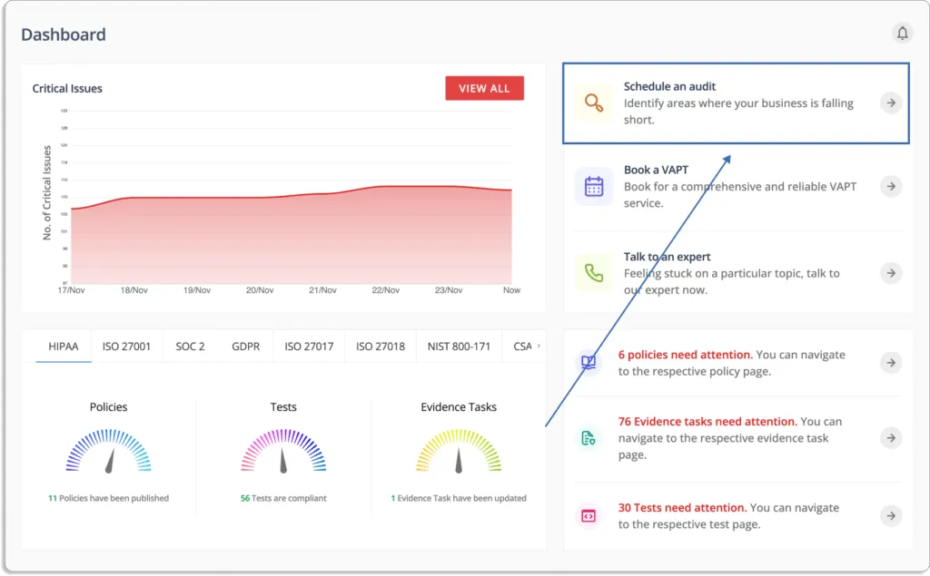 Some of the features of Scrut’s Audit Center dashboard may include: