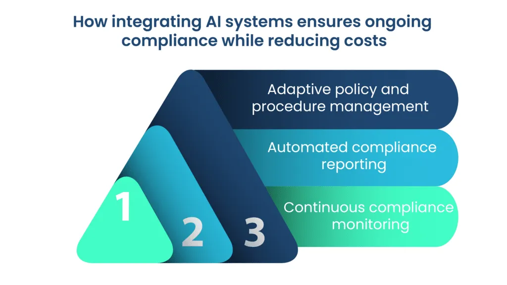 The integration of AI extends beyond regulatory adaptation, focusing on ongoing compliance with continuous support and monitoring, leading to significant cost reduction.