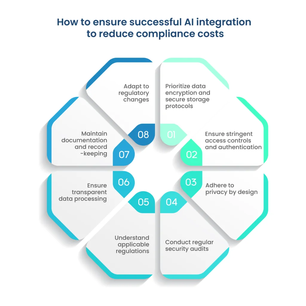 Successfully integrating AI to reduce compliance costs requires a strategic approach that addresses data security, privacy concerns, and ensures ongoing regulatory compliance.
