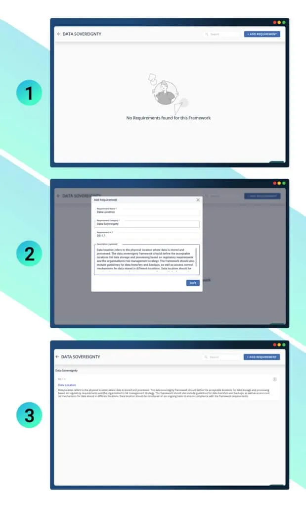 You can start adding requirements to your newly created framework by clicking on Add Requirement. Once you’ve entered the requirement details, click save. You can repeat the process for additional requirements.