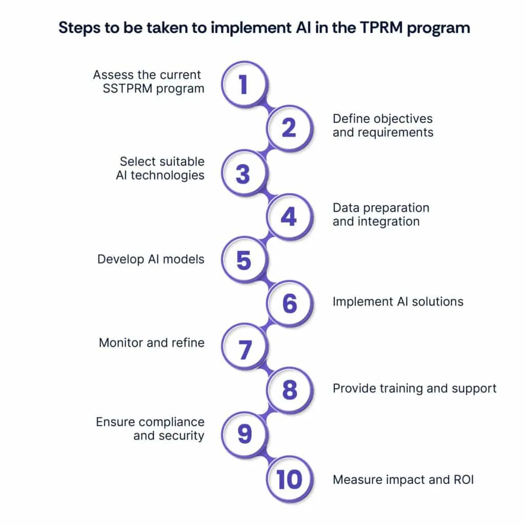 Implementing AI in TPRM involves assessing current processes, defining objectives, selecting suitable AI technologies, data preparation, model development, implementation, monitoring, training, and ensuring compliance.