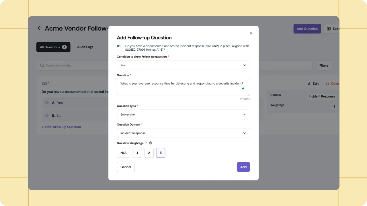 With Scrut’s new conditional follow-up question, you can automatically tailor following questions based on previous responses — keeping your assessments relevant and efficient.