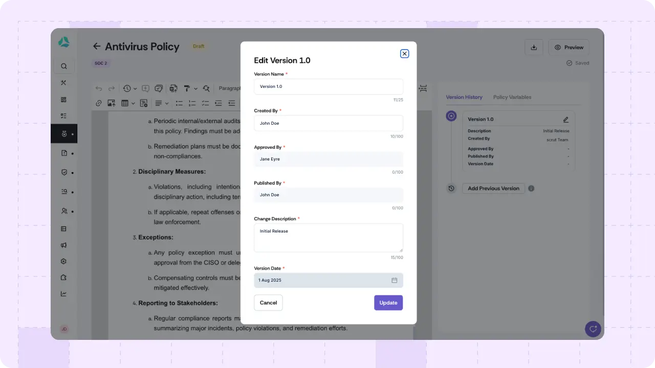 Scrut’s latest update to Policy Version History makes it easier to see, edit, and confirm version details — so you always have a complete, audit-ready record.