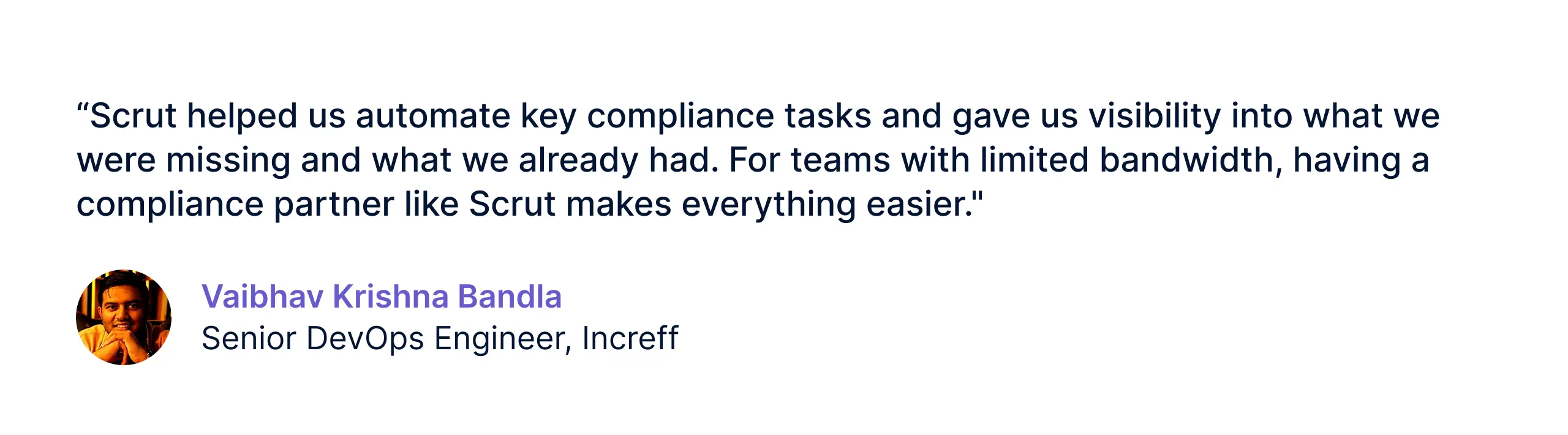 For Increff, a global supply chain technology company, scaling fast meant that manual workflows could no longer keep up. Scrut brought structure and automation, from policy templates to training and audit readiness, helping the team cut audit preparation time by nearly 50% while maintaining complete visibility across regions.