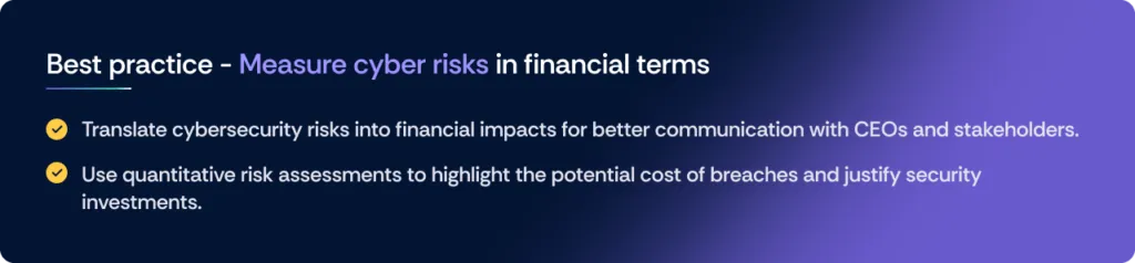 Measuring cyber risk in terms of financial terms puts things in perspective for the CEO and other stakeholders. However, how many CISOs do it? Well, PwC found that only 15% of organizations are actually doing it to a significant extent. That’s painfully low, as when CEOs and board members look at how cyber risk will affect their balance sheet, they would be more willing to invest in cybersecurity.