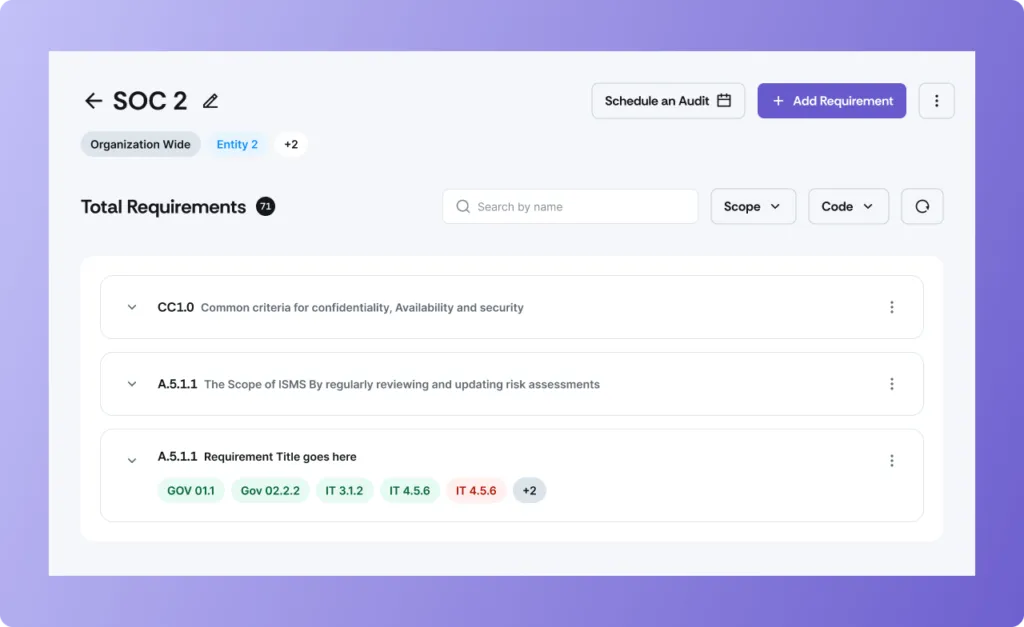 Scrut can not only help with SOC 2 but also with more than 50 other frameworks. Consolidating your compliance efforts can reduce the burden of evidence collection. The evidence you collect for one framework can also be used for other frameworks and standards, minimizing your efforts.