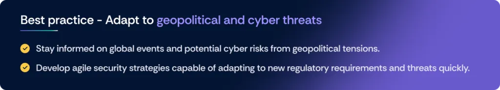 Global events and cyber threats stemming from geopolitical tensions pose significant risks to organizations. CISOs must ensure that security strategies are agile enough to adapt to new threats and regulatory requirements. The latest report by PwC indicates that there is an elevated risk of 49% in cyber risk (at the time this article was written) due to the recent geopolitical challenges the world is facing.