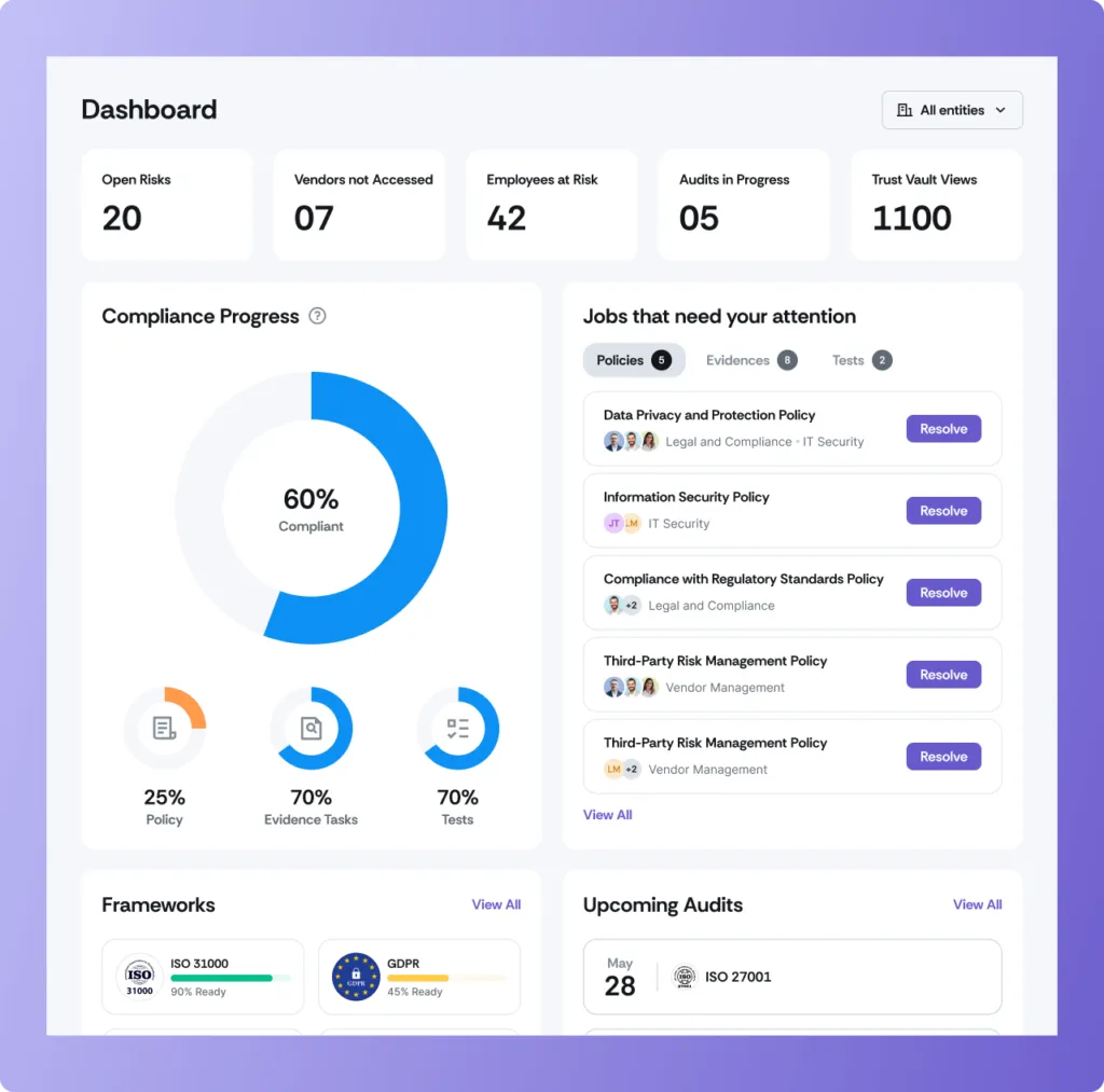 How Scrut Helps: Scrut streamlines compliance management, reducing manual efforts and allowing teams to focus on enhancing their security processes and cultivating a culture of compliance.