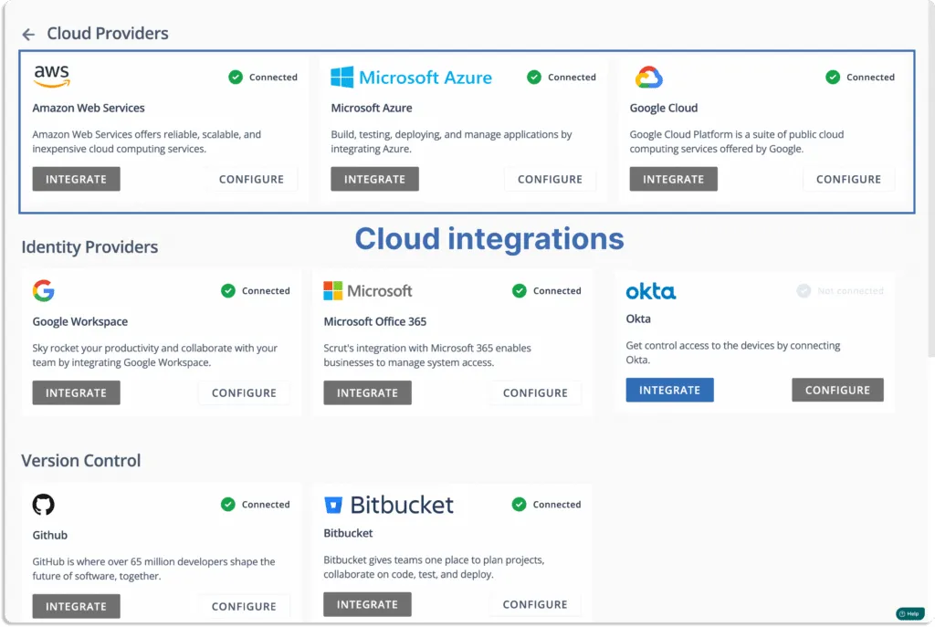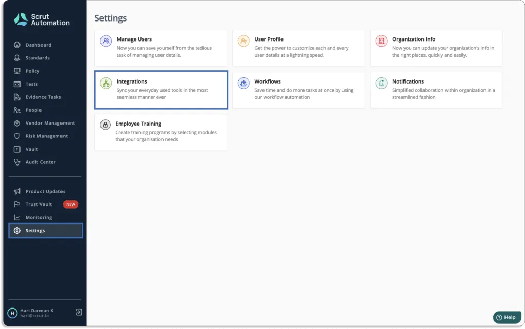 First, you need to connect your cloud infrastructure with the Scrut platform. This just takes a few minutes. Just go to Integrations under the Settings tab.
