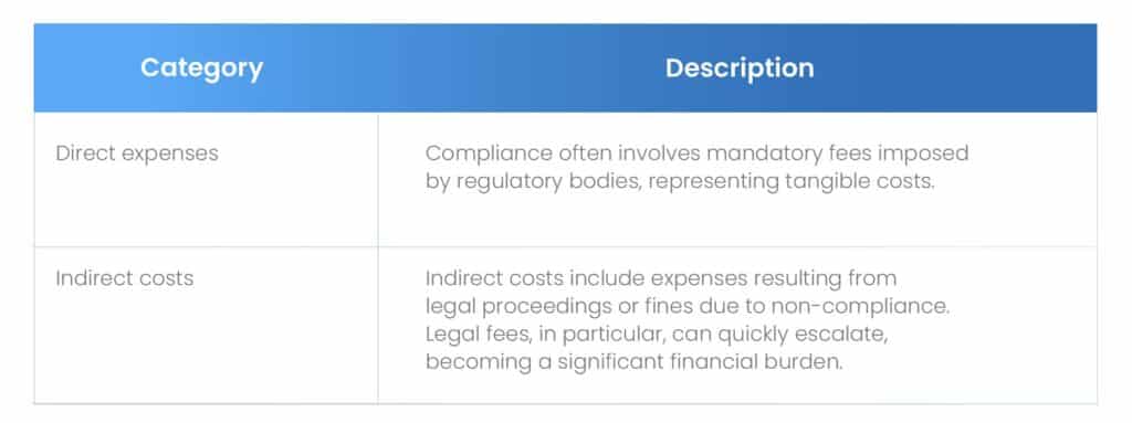 Traditionally, the focus on compliance costs has been primarily financial, involving direct expenses such as regulatory fees and indirect costs like legal fees and potential fines.