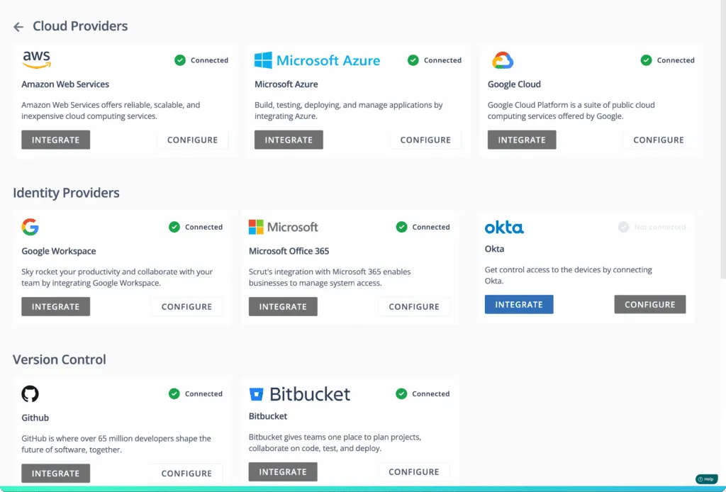 With seamless integrations with cloud service providers, HRMS, version control systems, etc., you get a real-time view of risk and compliance.