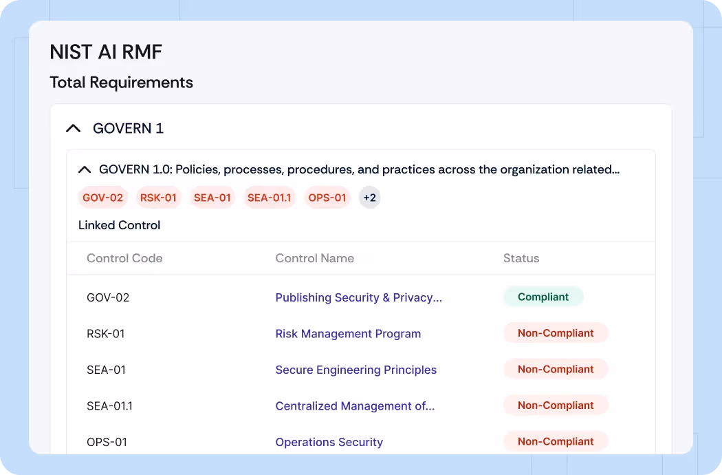 Automatically track NIST AI RMF controls status and collect evidence. Identify gaps through actionable dashboards and fix what matters.