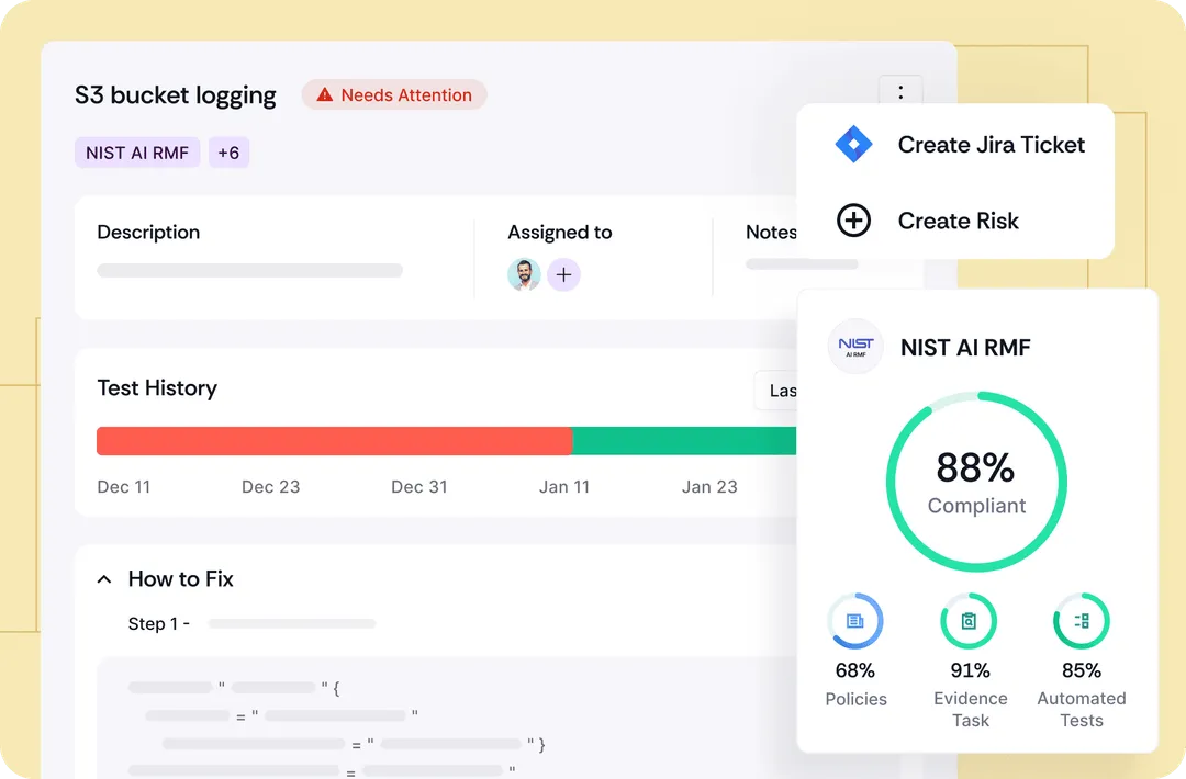 Leverage hundreds of pre-built tests to identify gaps against NIST AI RMF controls. Let the platform monitor your controls continuously, and automatically gather evidence in auditor-friendly formats.